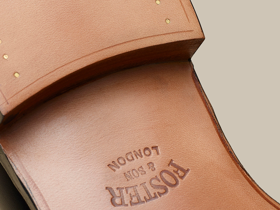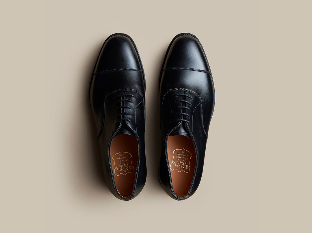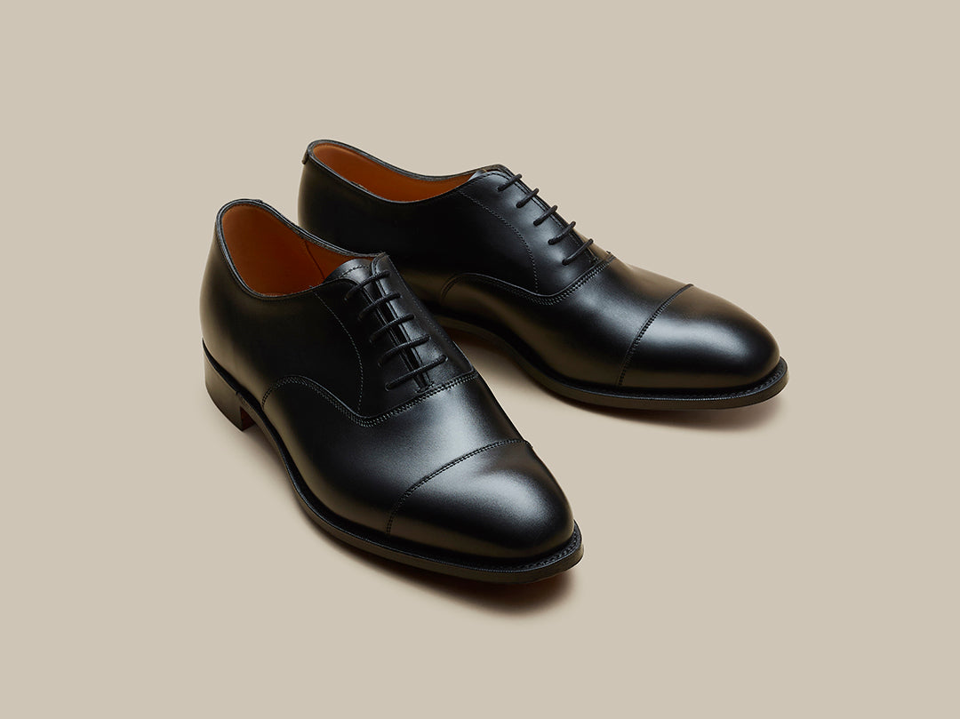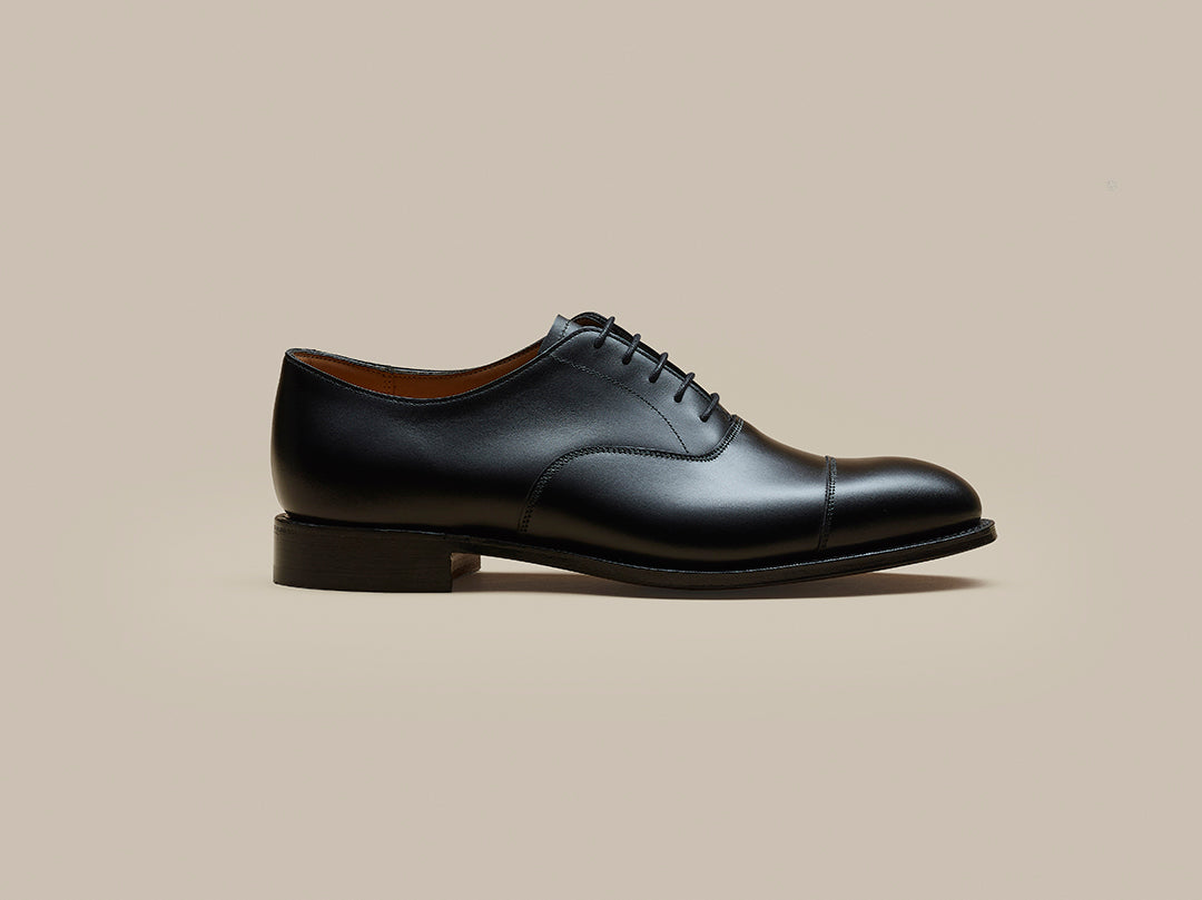 The Highclere has been part of our ready to wear collection for over 20 years. Ideal for formal occasions. Made in England using smooth black calf, featuring cap-toe detail. With a single leather sole, perfect for sharp tailoring.