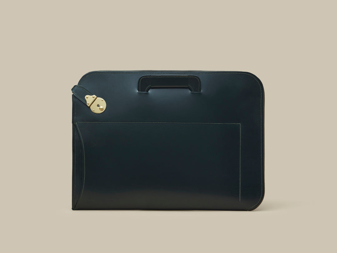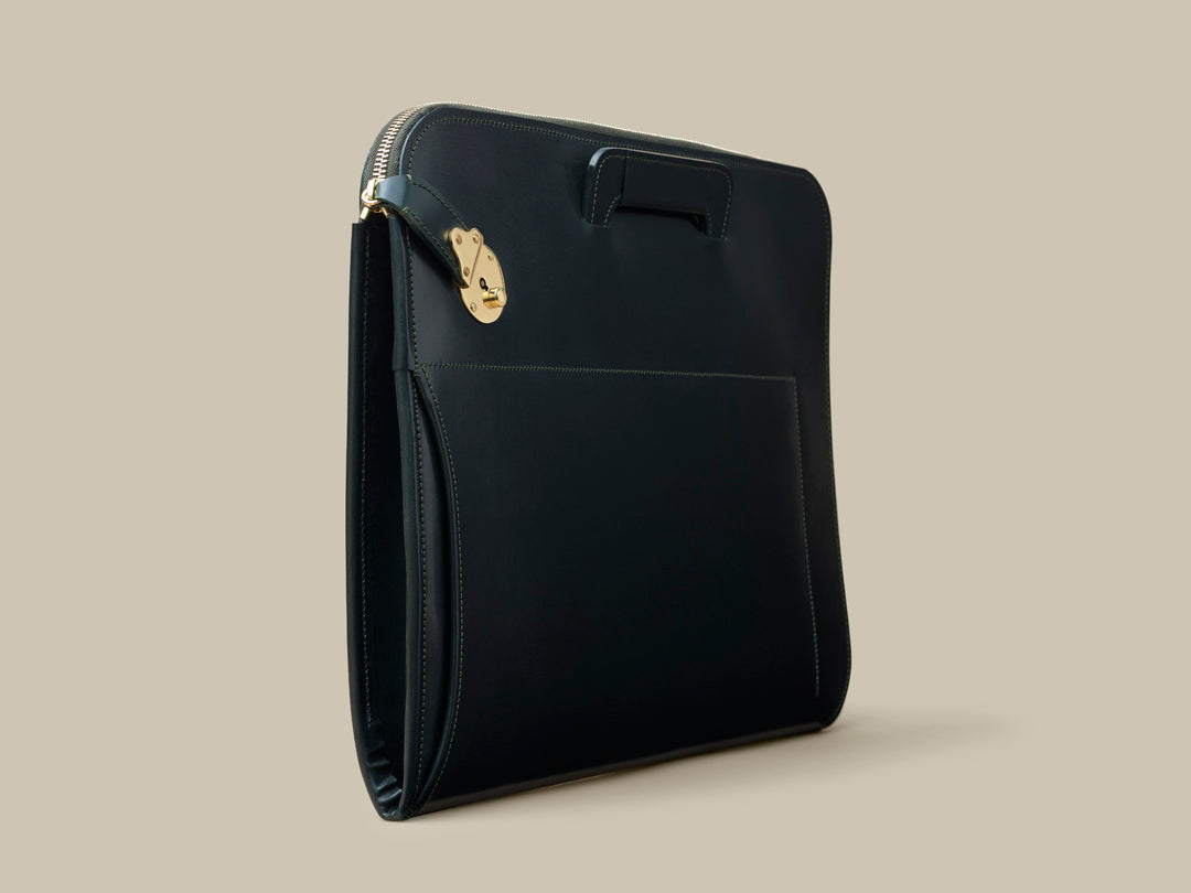 Our retractable handle portfolio featuring a brass lock for added security and newspaper holder with suede lining. This practical and timeless portfolio in the finest English bridle leather has retractable