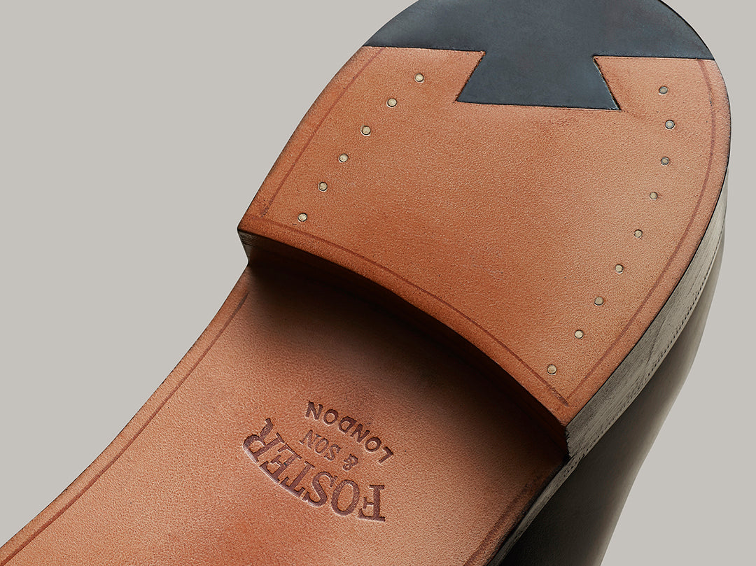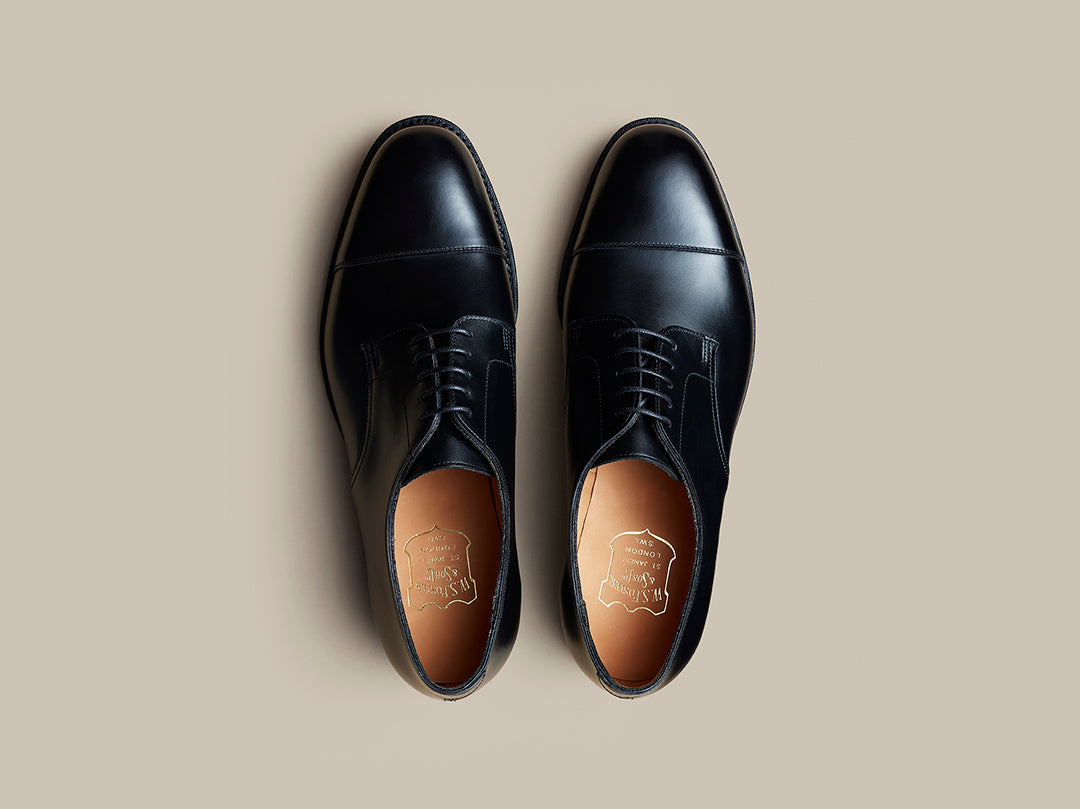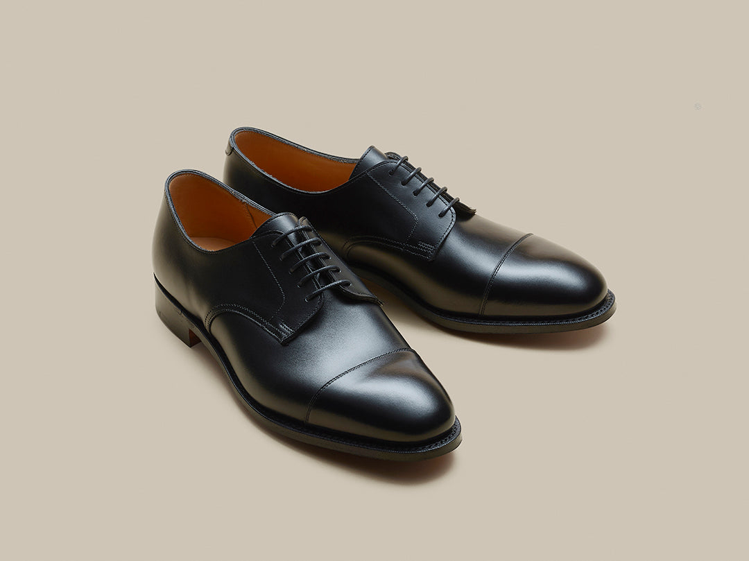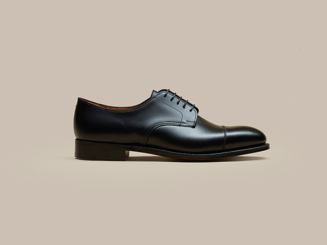 The Haymarket Derby Ideal for those with a higher instep. Made in England using smooth black calf, featuring cap-toe detail. With leather sole, perfect for sharp tailoring.