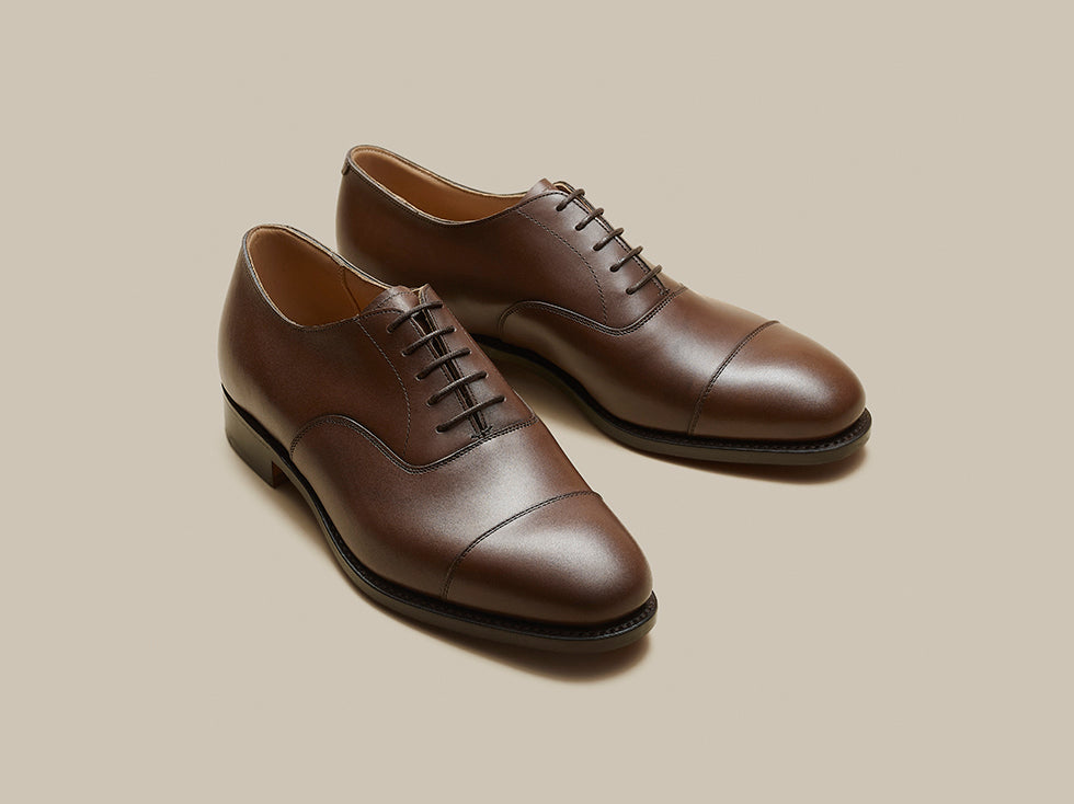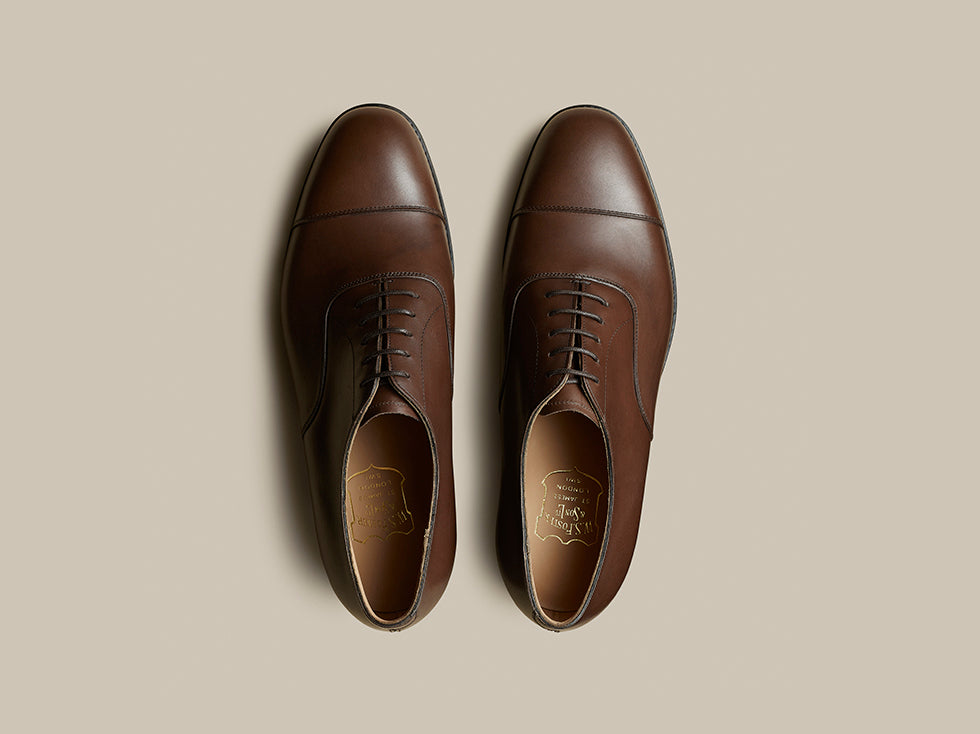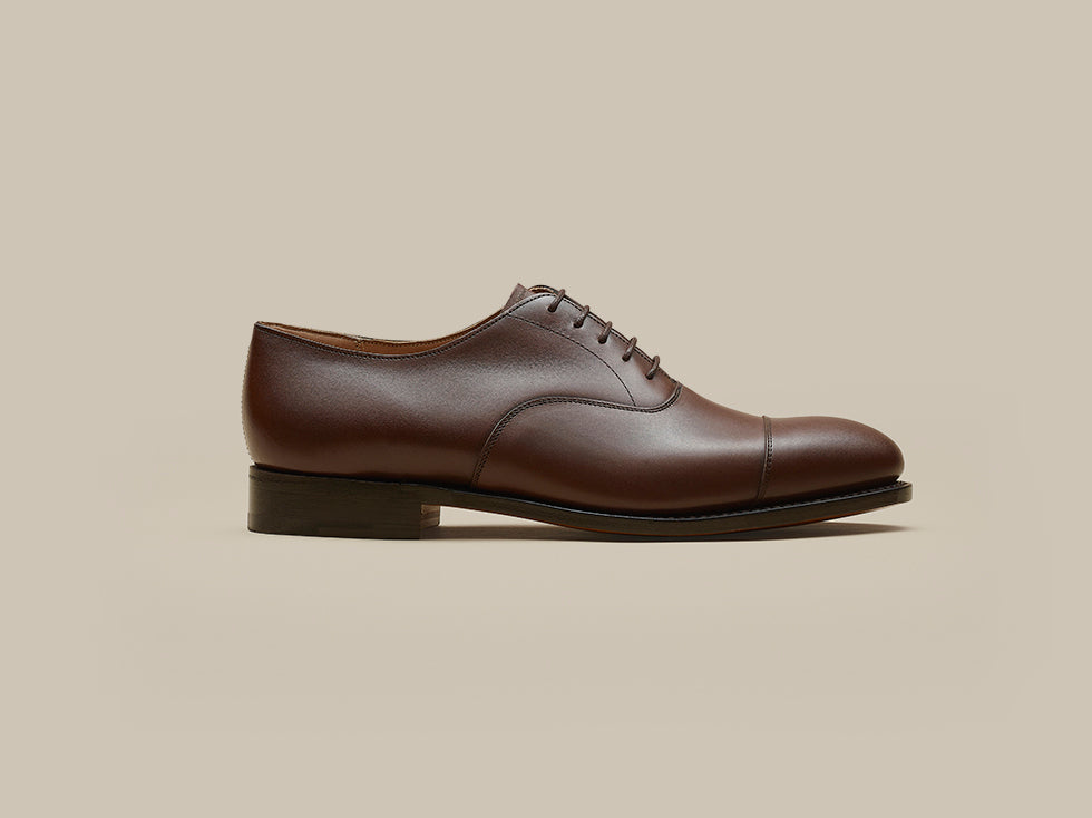 The Highclere has been part of our ready to wear collection for over 20 years. Ideal for formal occasions. Made in England using smooth brown calf, featuring cap-toe detail. With a single leather sole, perfect for sharp tailoring.